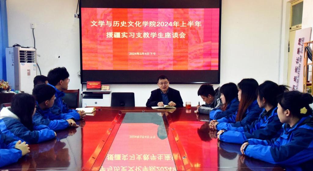 教育援疆是促进团结、凝聚人心的文化工程,援疆教师是做好教育援疆工作的关键核心力量。3月4日,在2024年上半年援疆实习支教学生即将出征之际,文学与历史文化学院召开“援疆实习支教学生座谈会”。文学与历史文化学院院长张文哲,副院长孙红玉、朱振华,辅导员徐超、朱迪康以及12名援疆实习支教学生参加会议。