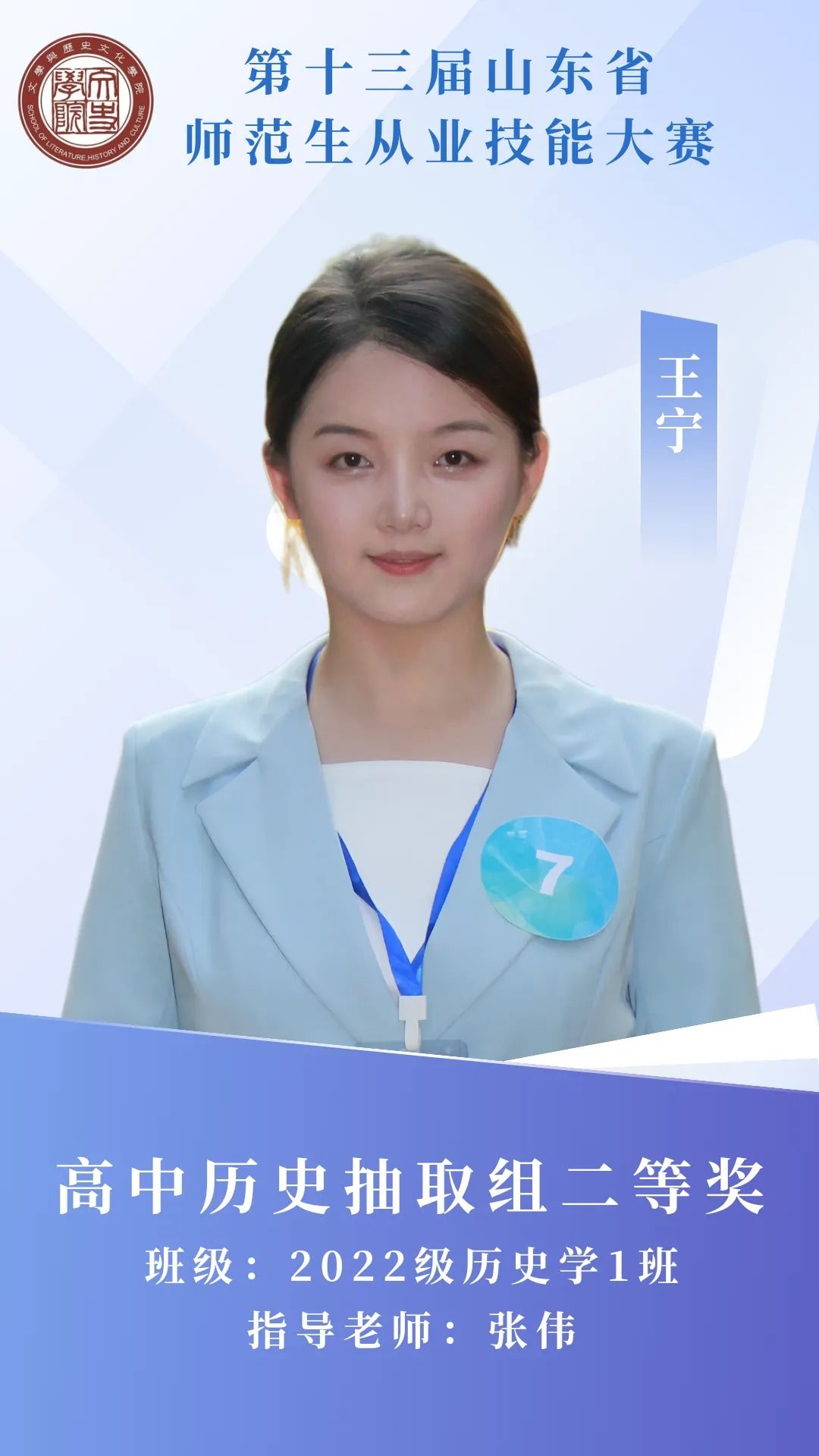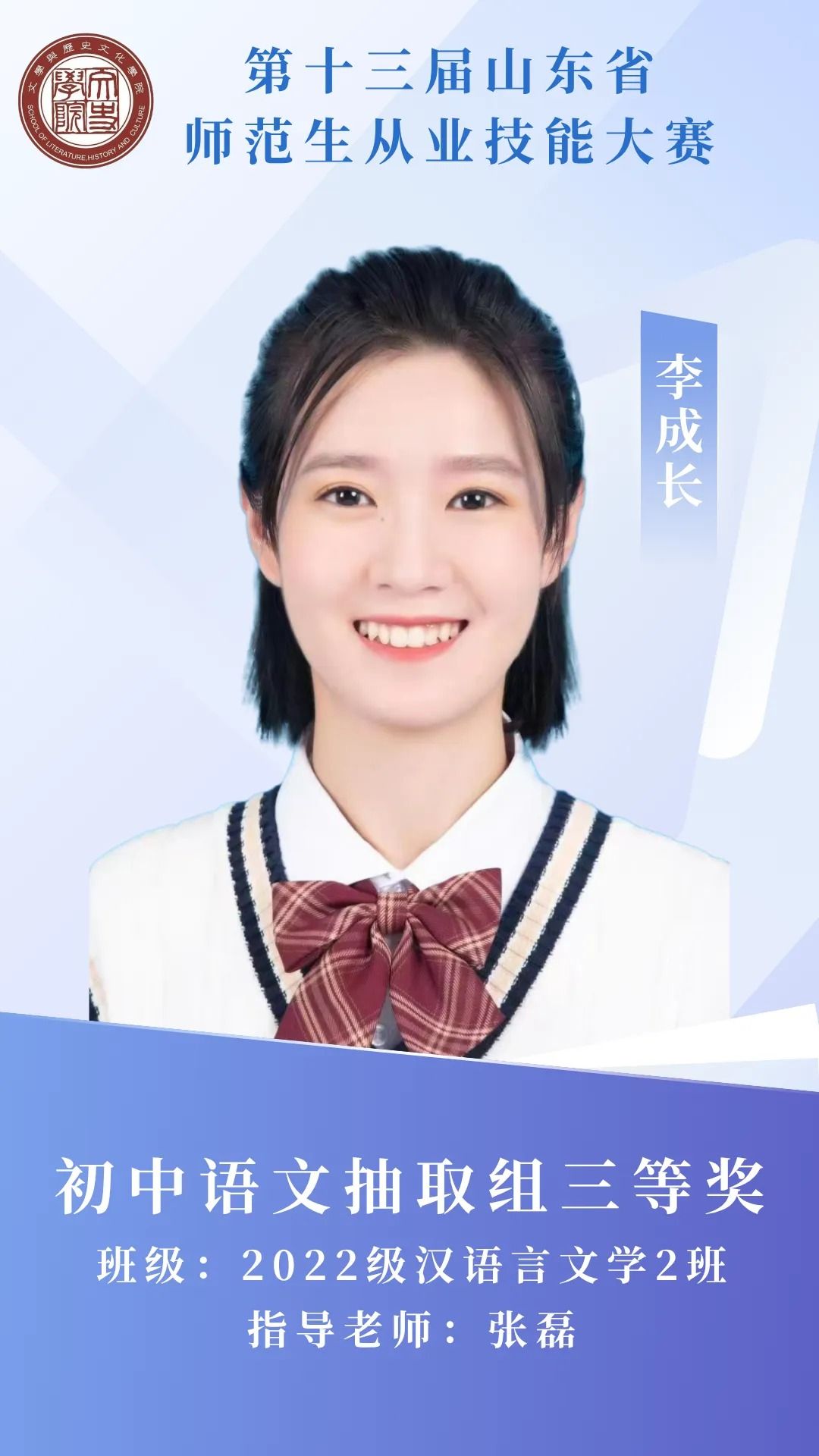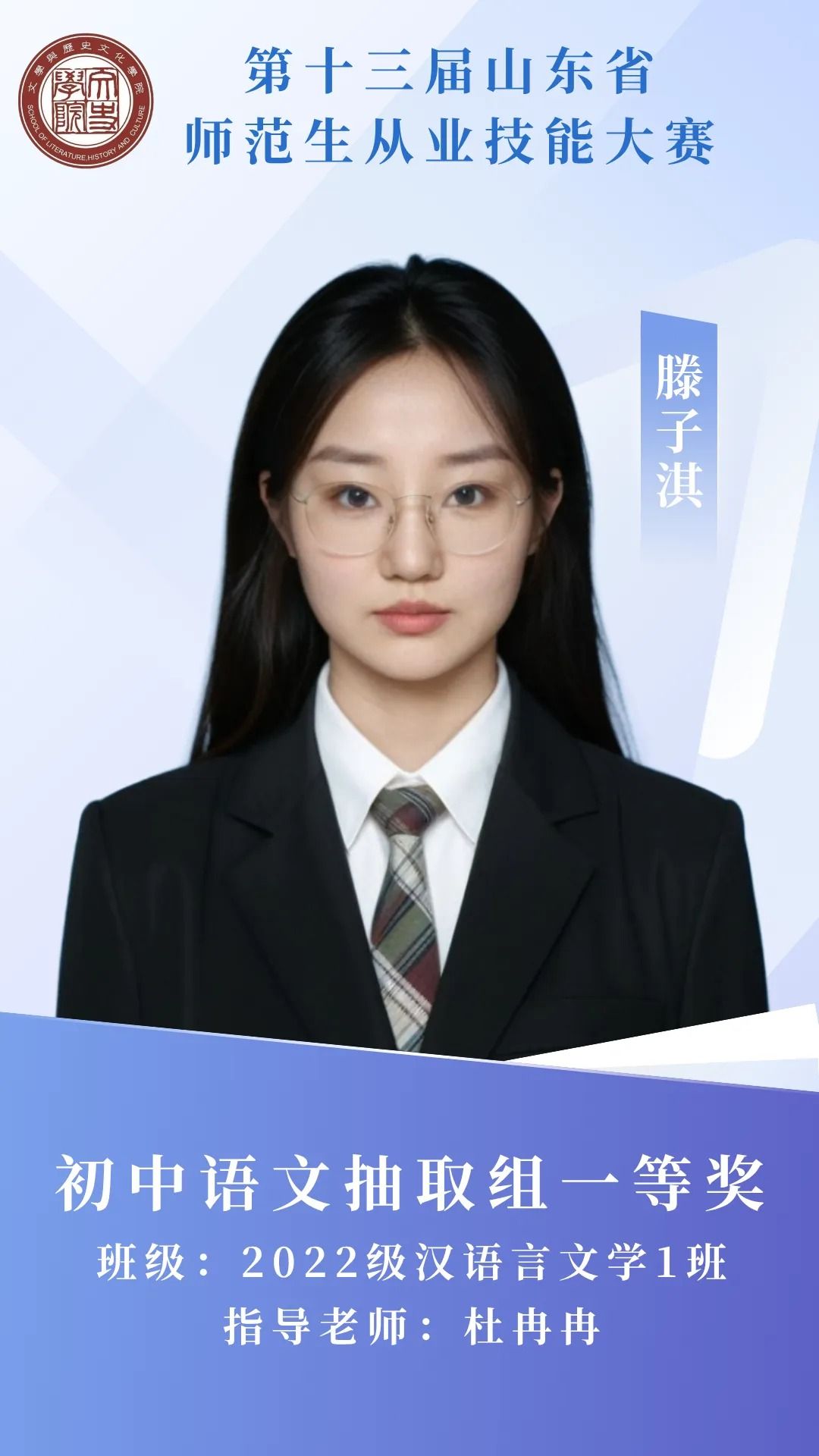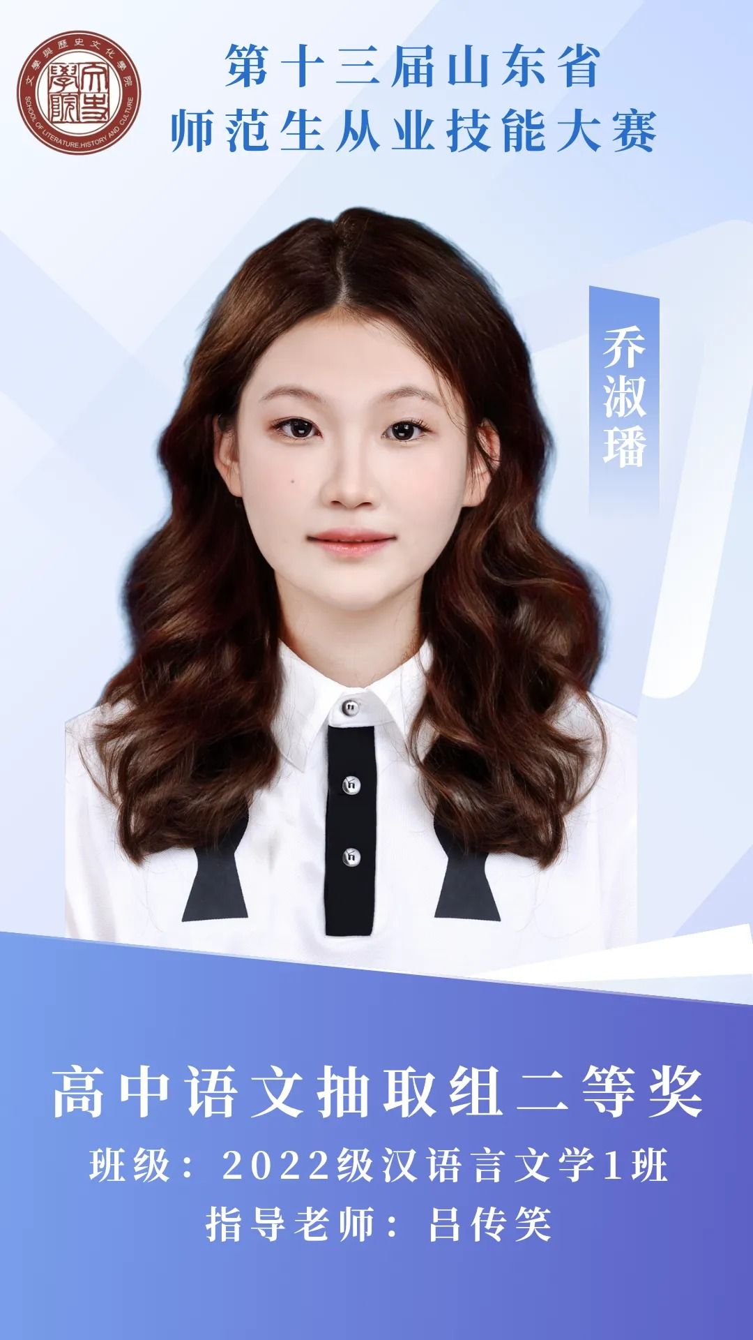 赛场砺剑,杏坛筑光;笔耕不辍,终绽芳华。那些反复打磨教案的日夜,那些模拟授课时的专注投入,都成为成长路上的注脚。热烈祝贺我院11名学子在第十三届山东省师范生从业技能大赛中突围而出,用实力捧回荣誉!今天,就让我们共同见证他们的闪耀时刻 。