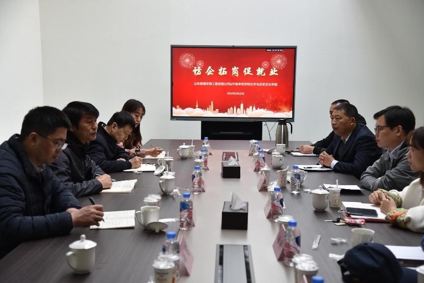 宋新刚介绍了齐鲁师范学院的专业设置、办学特色、人才培养和招生就业情况,他希望双方在人才培养、学历提升以及就创业服务等方面进行深度合作,积极为毕业生创造更大的成长和发展空间,搭建更好的平台为毕业生就创业提供服务。文学与历史文化学院党委书记胡义忠、院长张文哲分别表示,希望与企业在学生实习实训、就业、科研创新等方面加强合作,探索产教融合育人途径,整合优质就业资源,实现校企共赢发展。并希望将进一步听取企业方面的意见和要求,优化人才培养方案,提升人才培养质量,更深层次、更全面地服务地方经济社会发展。