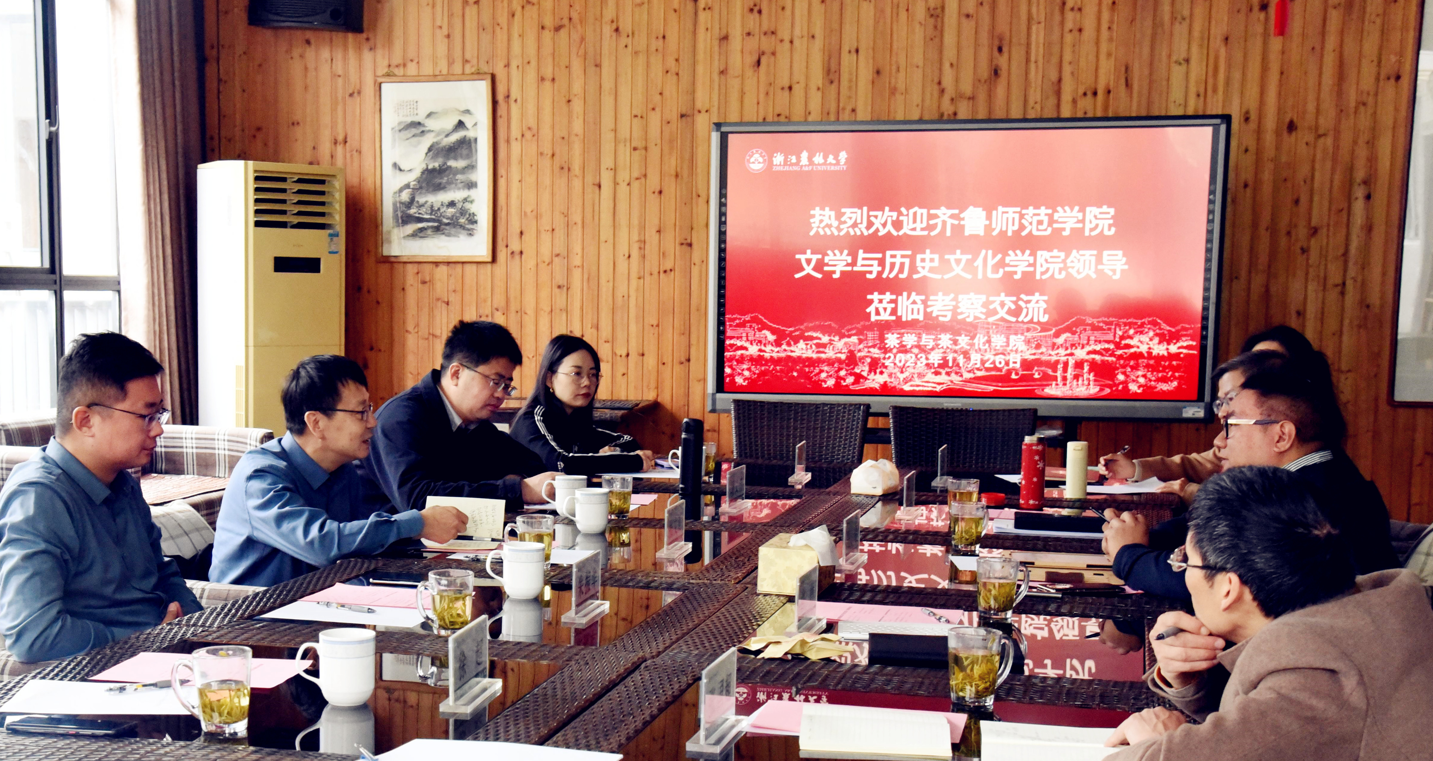 11月25日,为学习借鉴先进经验与典型做法,着力谋划推动学院办学水平和专业建设高质量发展,齐鲁师范学院文学与历史文化学院院长张文哲,学院党委书记胡义忠,副院长兼乡村振兴研究院副院长朱振华等赴浙江农林大学考察交流。浙江农林大学茶学与茶文化学院院长王磊、副院长张帅,文化产业管理(茶文化)专业负责人周新华及茶文化专任教师代表等陪同调研。