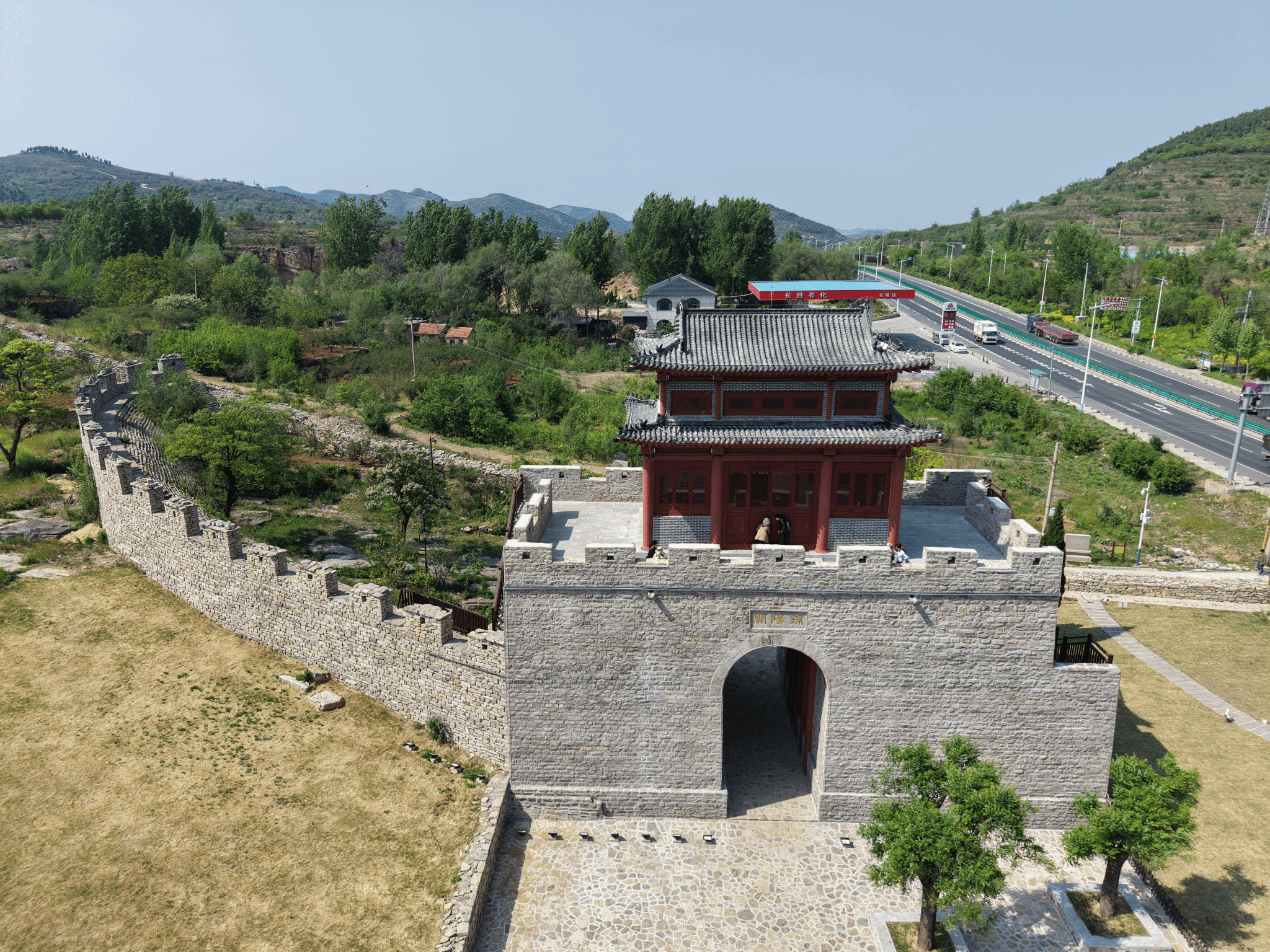 锦阳关作为齐长城三大重要关隘之一,是齐鲁分界的标志性节点,关北为齐、关南为鲁,自古扼守南北交通咽喉,文脉绵延两千五百余年,更是典型的山脊型线性文化遗产。这里石砌长城本体与后期复建关楼并存,西侧连续石砌长城为文物本体,关楼为2005年复建,二者价值与保护属性不同,是本次实践重点考察内容之一。