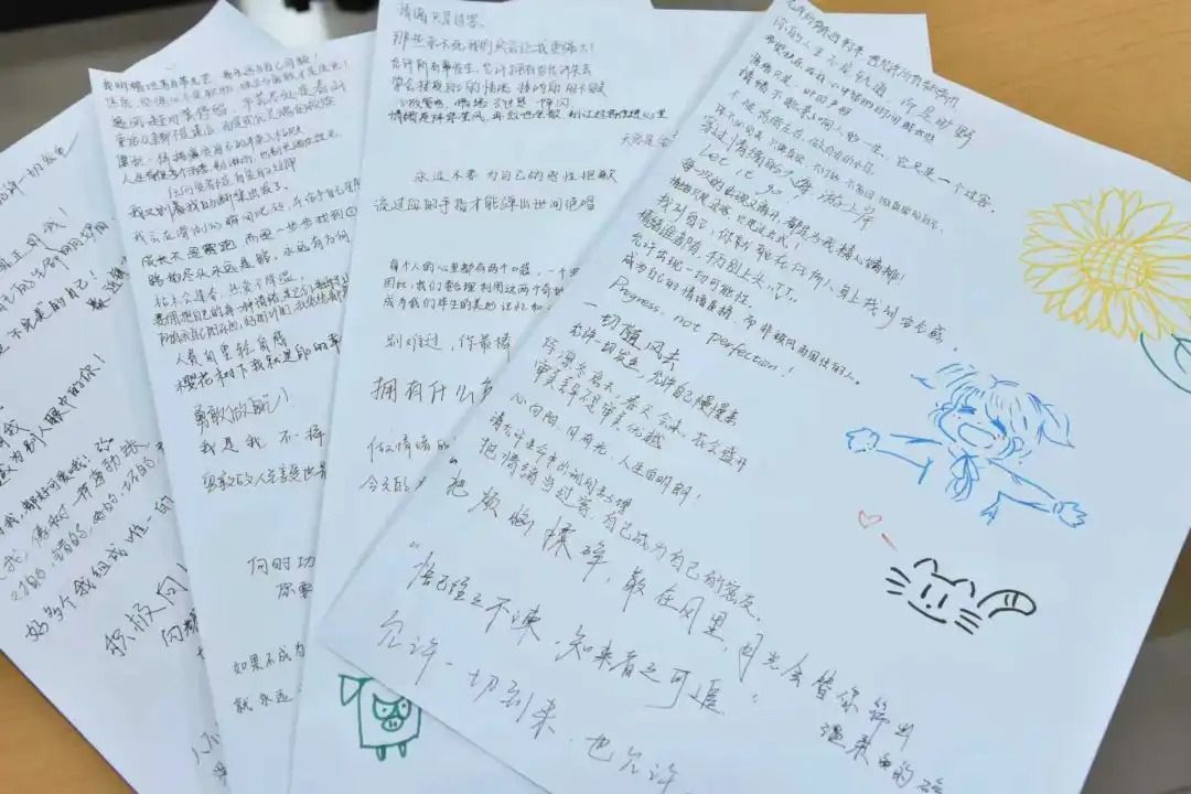 核心的读书感悟环节在柔和舒缓的音乐中展开,同学们沉浸式阅读主办方推荐的心理类书籍,结合书中触动人心的片段,提笔写下内心最真实柔软的思考与感悟。紧接着的“文字传递接龙”环节极具巧思,大家围绕暖心照片的第一观感联想创作,在落笔与分享间,既锻炼了情感表达能力,更深化了对自身内心世界的认知,一句句真挚话语既是对自我的期许,亦是与他人守望相助的温暖鼓励。