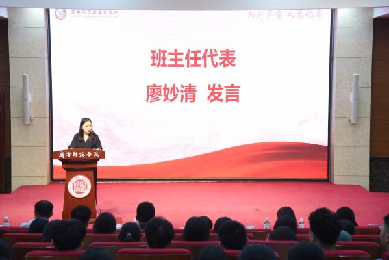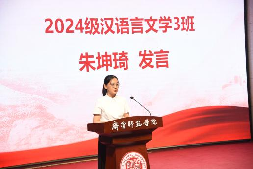 2021级历史学2班学生宋时超向新生分享了自己大学的学习与生活的心得体会,并希望所有同学能珍惜时光,专注专业学习;保持初心,勇敢追梦。2024级中国语言文学类3班学生朱坤琦表示,她表示将用实际行动践行“博学明道,崇德象贤”的校训和“知行合一、人文化成”的院训,努力将个人理想同国家命运、民族复兴紧密联系在一起。