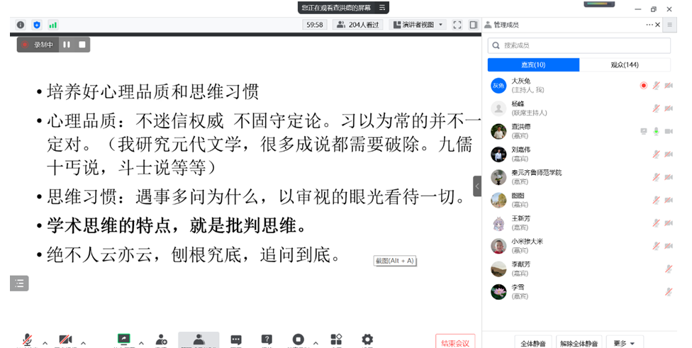 12月8日下午,南开大学查洪德教授通过腾讯会议做客文学院“博文讲坛”,作题为“学术追求与学术自信”的学术报告。报告由文学院院长杨峰教授主持,姜学科副教授和王天舒博士负责会务。文学院师生与南开大学、山东大学等高校的学者、学生150余人听取了报告。