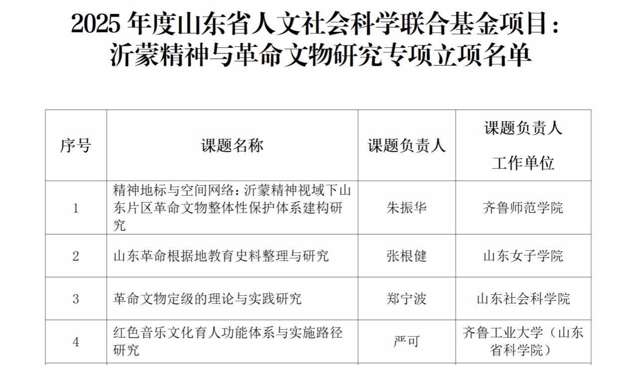 近日,山东省社会科学界联合会公示了2025年度山东省人文社会科学联合基金项目“沂蒙精神与革命文物研究专项立项名单”。齐鲁师范学院文学与历史文化学院副院长朱振华教授团队申报的“精神地标与空间网络:沂蒙精神视域下山东片区革命文物整体性保护体系建构研究”成功立项。该项目成功获批是学院近年来在弘扬齐鲁优秀传统文化,传承中华民族优秀历史文化遗产,增强历史自觉、坚定文化自信,深耕红色文化遗产保护领域取得的新突破。
